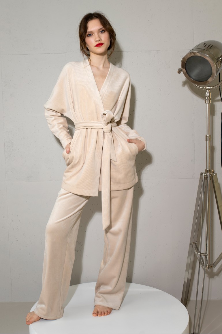 Верх — це подовжена сорочка-кімоно прямого силуету з поясом, що зав’язується на талії. Рукави довгі, з м’якою посадкою. Низ — широкі штани вільного крою, які плавно формують силует і створюють відчуття легкості та комфорту. Тканина виглядає гладкою й делікатною, що підсилює загальний лук у напрямі розкоші з акцентом на лаконічність.Образ загалом — про стриману елегантність, комфорт і витончену класику.