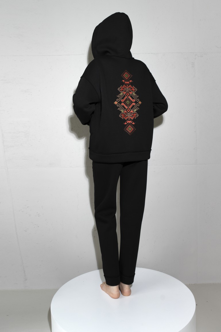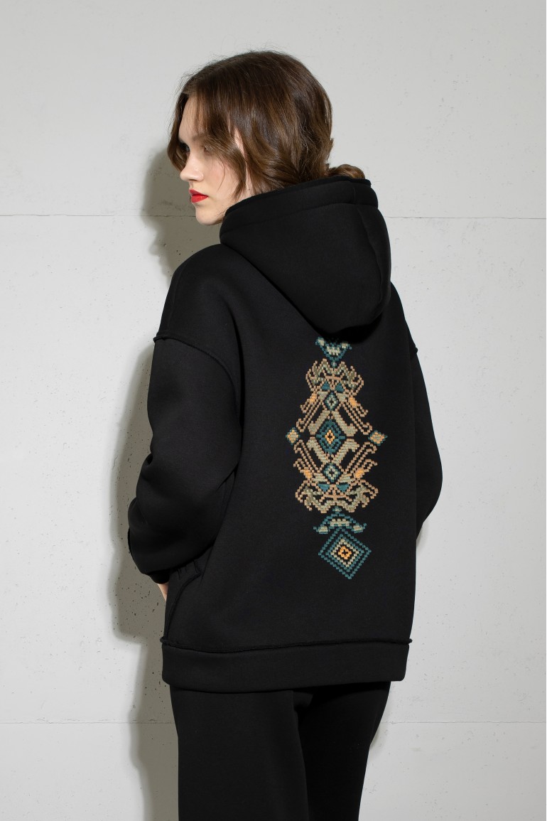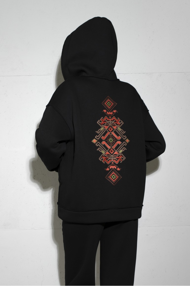 Це класична модель на блискавці з великим, м’яким капюшоном. Силует вільний, зі спущеною лінією плеча, що додає сучасної розслабленості. Є об'ємні накладні кишені-кенгуру, інтегровані у передню частину. Манжети та нижня резинка щільні, тримають форму. Основний акцент: вертикальна декоративна композиція, виконана у стилі орнаменту. Вона розміщена по центру спини й виглядає як складна геометрична вишивка або аплікація з симетричною побудовою. Орнамент додає характеру, культурної глибини та індивідуальності, поєднуючи стриманий крій зі змістовною деталізацією.