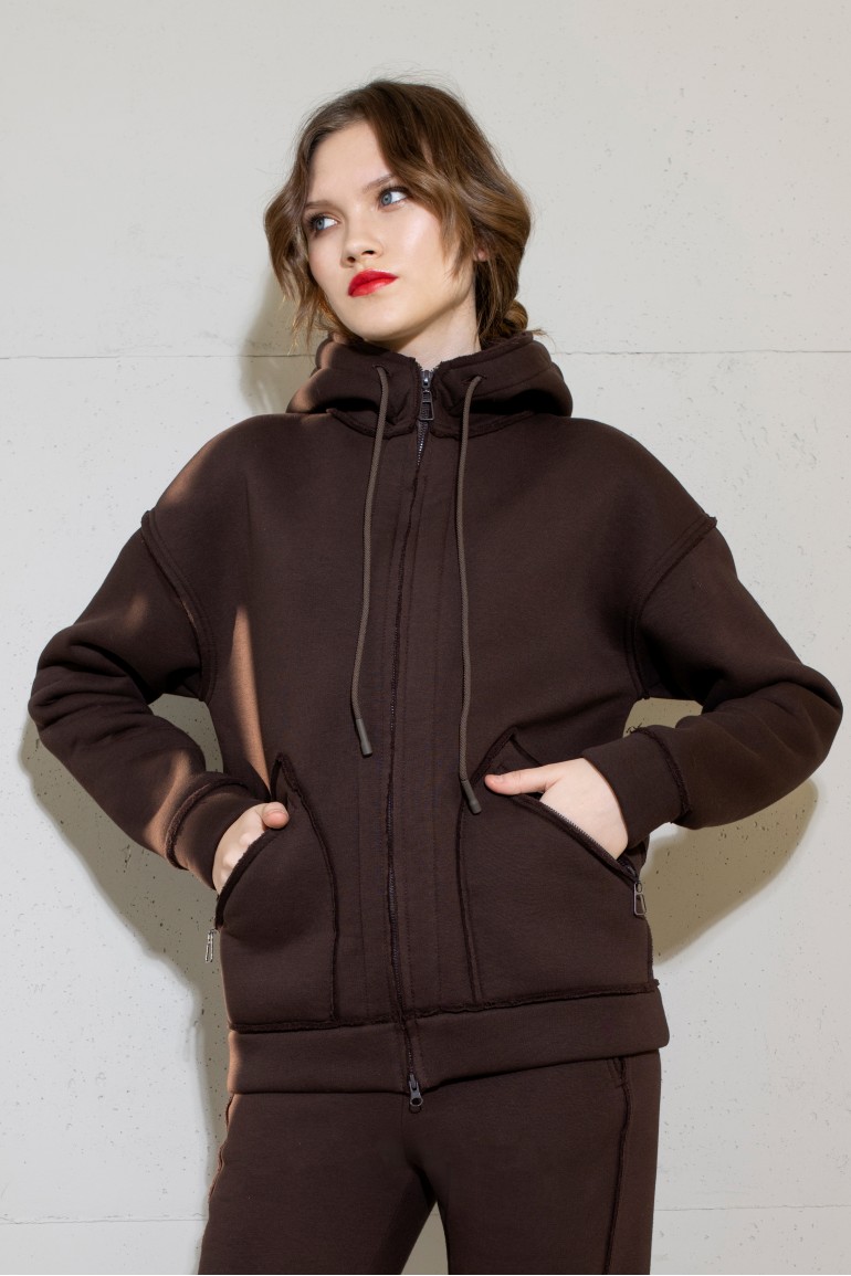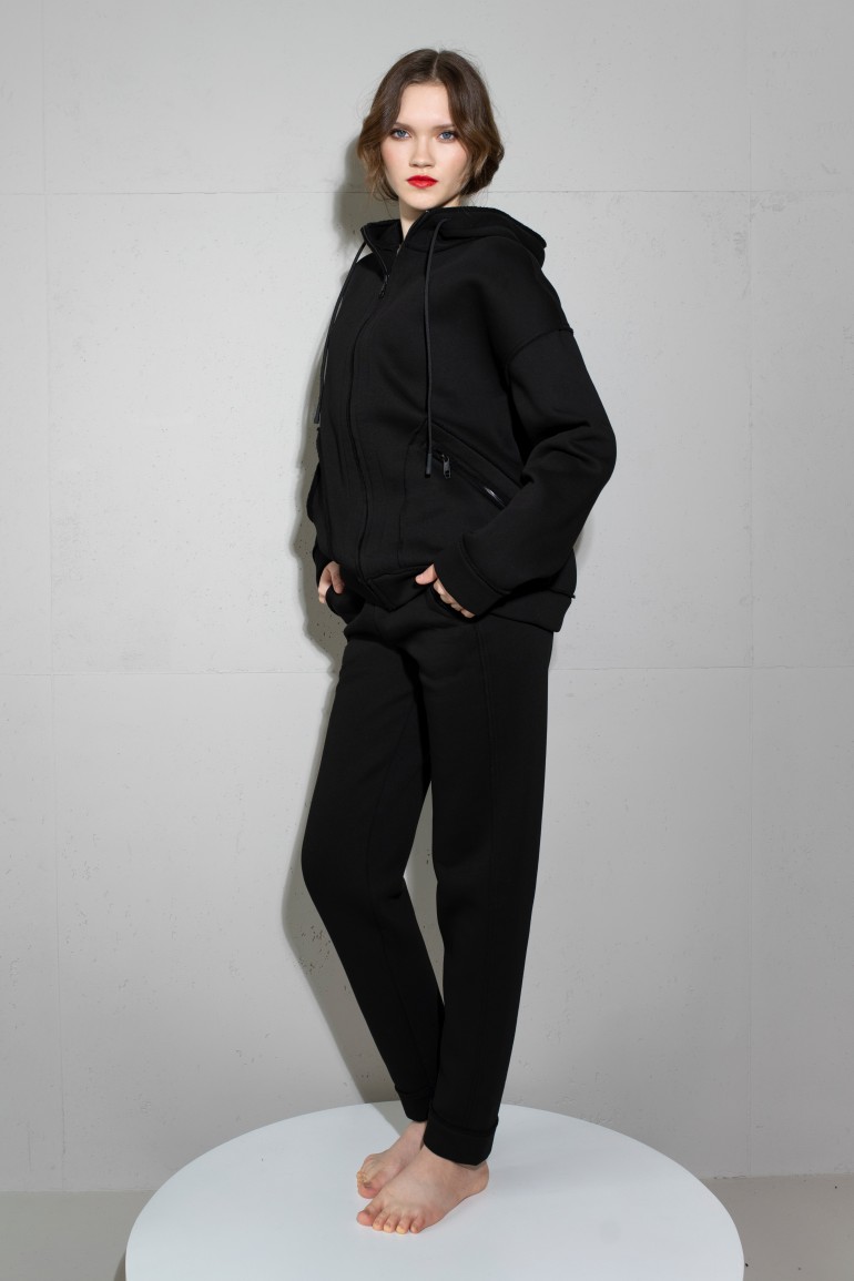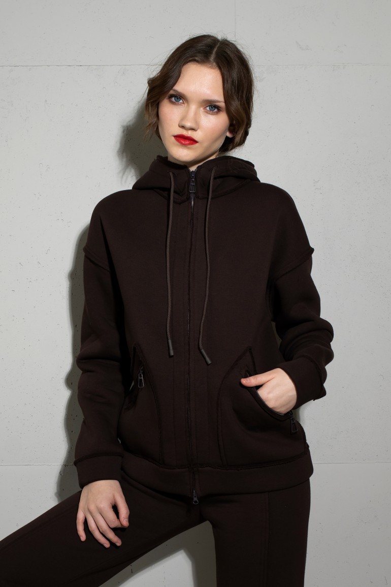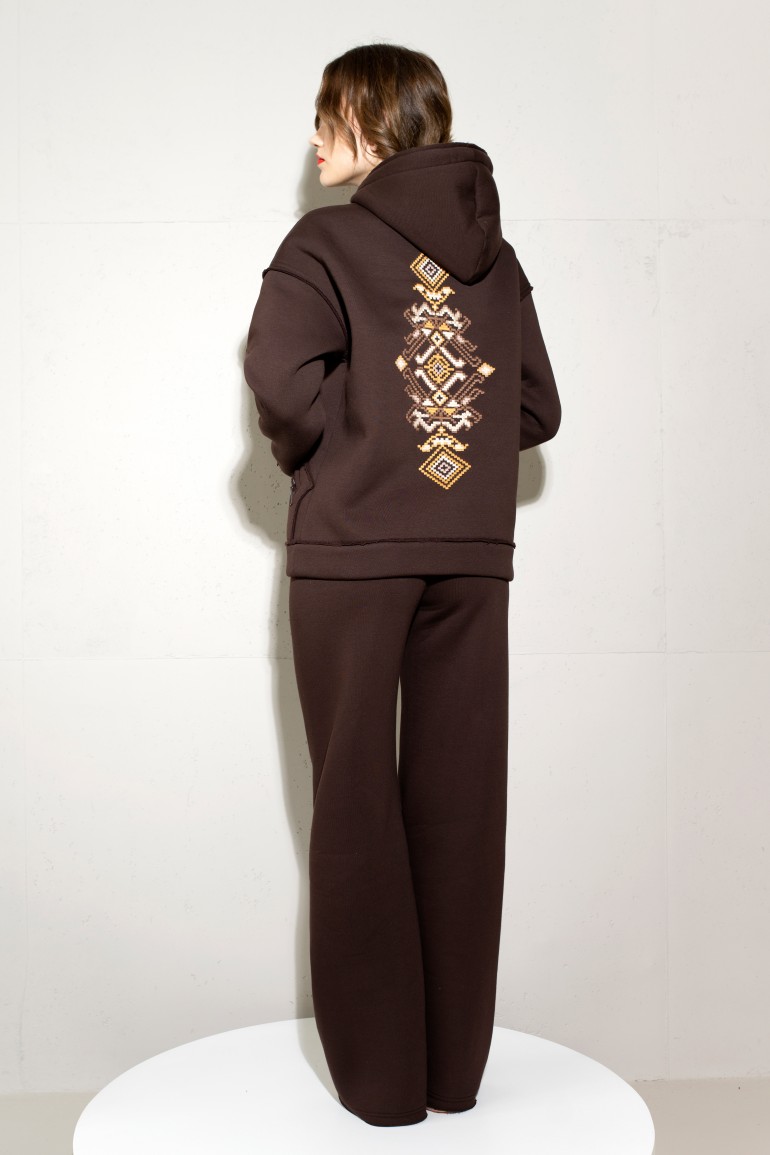 Це класична модель на блискавці з великим, м’яким капюшоном. Силует вільний, зі спущеною лінією плеча, що додає сучасної розслабленості. Є об'ємні накладні кишені-кенгуру, інтегровані у передню частину. Манжети та нижня резинка щільні, тримають форму. Основний акцент: вертикальна декоративна композиція, виконана у стилі орнаменту. Вона розміщена по центру спини й виглядає як складна геометрична вишивка або аплікація з симетричною побудовою. Орнамент додає характеру, культурної глибини та індивідуальності, поєднуючи стриманий крій зі змістовною деталізацією.