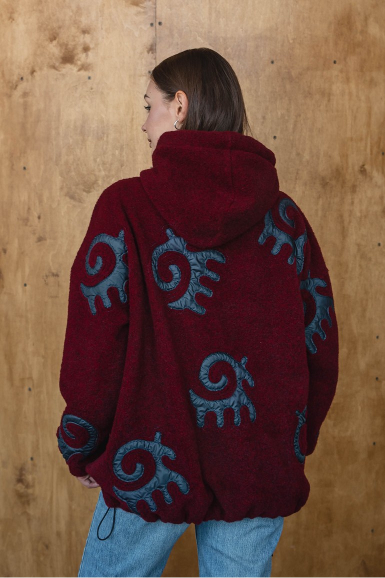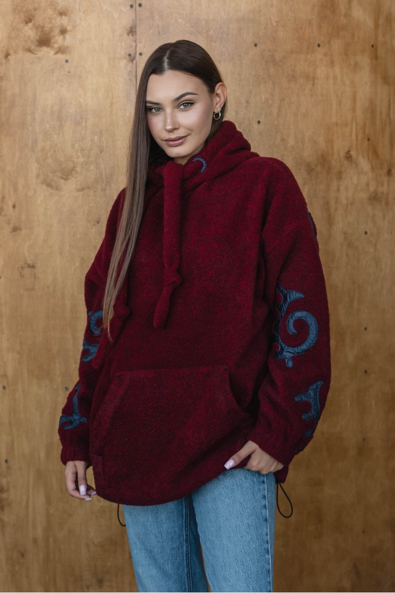 Об'єна кофта з м'якого трикотажу вільного крою. Плечі трішки спущені, зручний капюшон та містка кишеня-кенгуру. Вишивка-аплікація поєднує етнічні та сучасні мотиви, що надає кофті унікальності та робить її акцентною річчю у повсякденному образі.