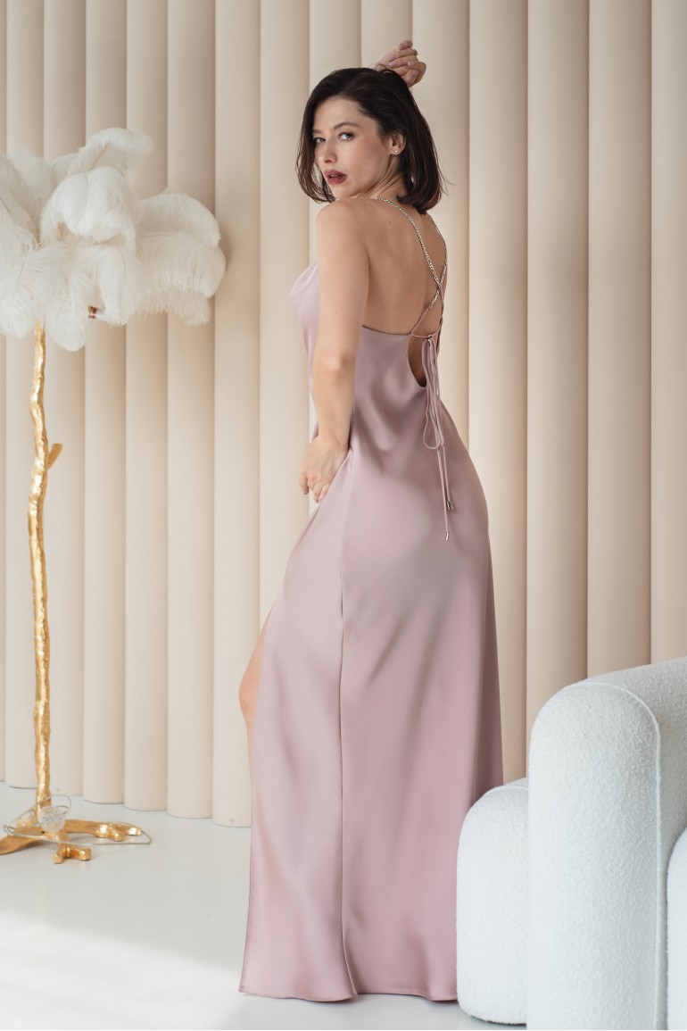 Вечірня сукня зробить зіркою свою власницю на будь-якому заході. Хоча на ній мінімально декорацій, вона виглядає достатньо елегантно та вишукано. Плаття покроєно по довжині майже в підлогу, донизу виріб має невелике розширення, що забезпечує глибокий виріз. Родзинкою вечірньої сукні можна вважати драпірування в передній частині, позаду на спинці сукню прикрашають тонкі бретельки хрест навхрест, які акцентують глибокий виріз сукні.