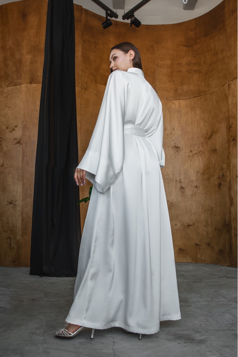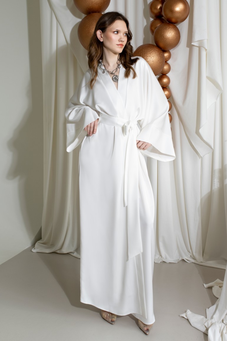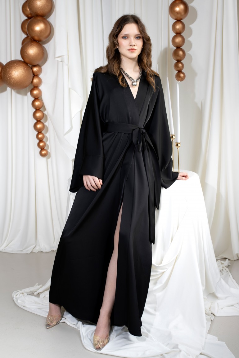 Витончена сукня-кімоно - втілення мінімалістичної елегантності. Вільний крій із широкими рукавами та глибоким запахом підкреслює природну грацію, а пояс на талії формує жіночний силует.