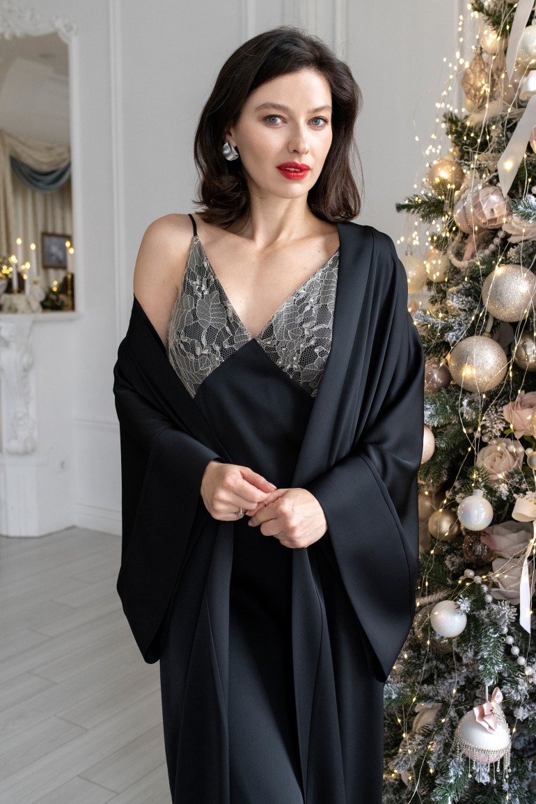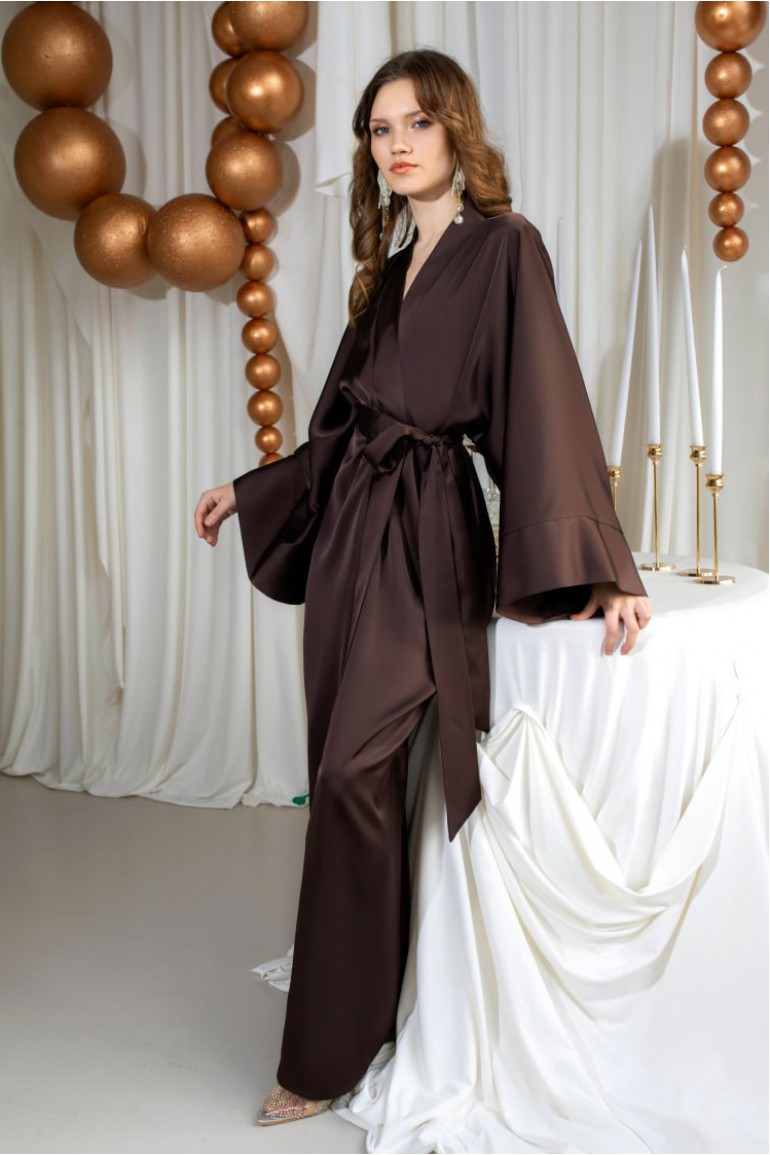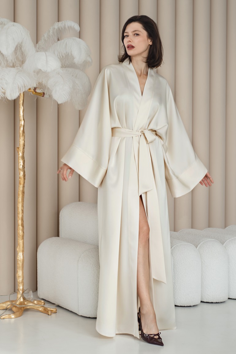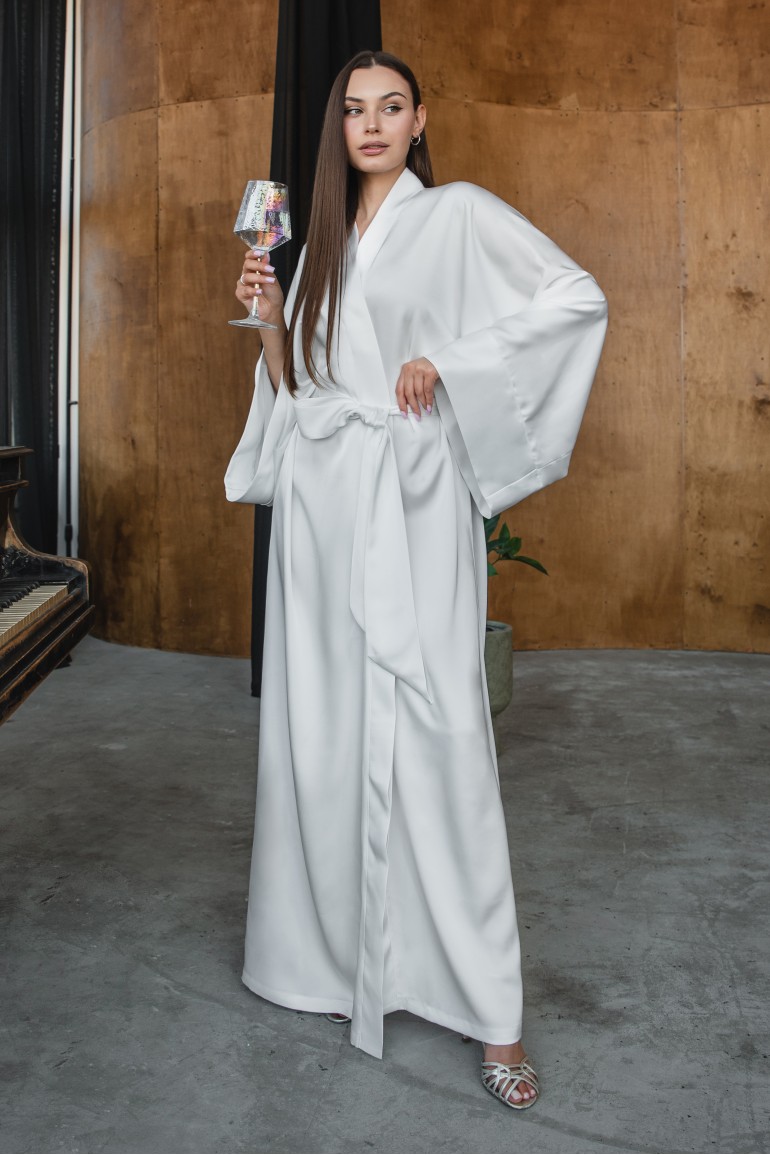 Витончена сукня-кімоно - втілення мінімалістичної елегантності. Вільний крій із широкими рукавами та глибоким запахом підкреслює природну грацію, а пояс на талії формує жіночний силует.