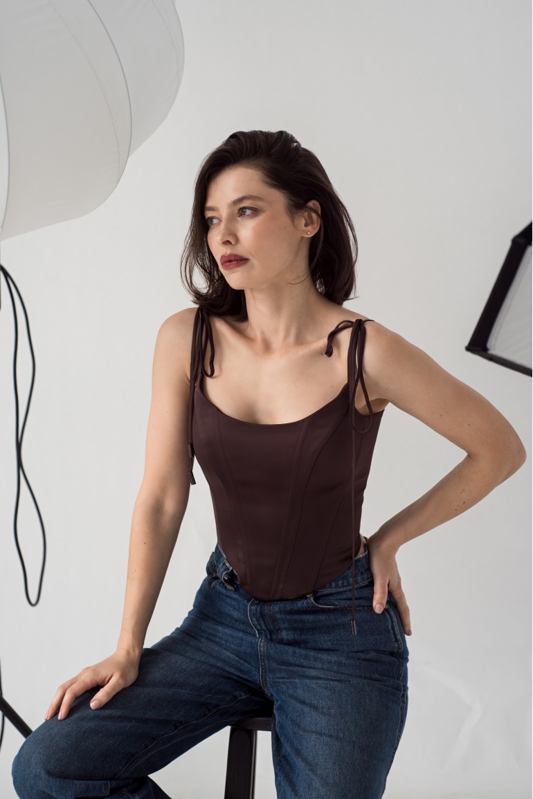 Цей корсет поєднує сучасний стиль та елегантну простоту. Завдяки витонченому дизайну, він легко вписується в різні стилі одягу, від casual до більш святкових образів. Зав'язки на плечах додають особливого шарму, а сама модель створює ефект витягнутої фігури, що підкреслює жіночність. Робота над таким корсетом включає точне пошиття та акуратну обробку деталей, що забезпечує комфорт та естетичну привабливість. Це не просто базовий елемент гардеробу, а стильний акцент, який підходить для будь-якої ситуації.