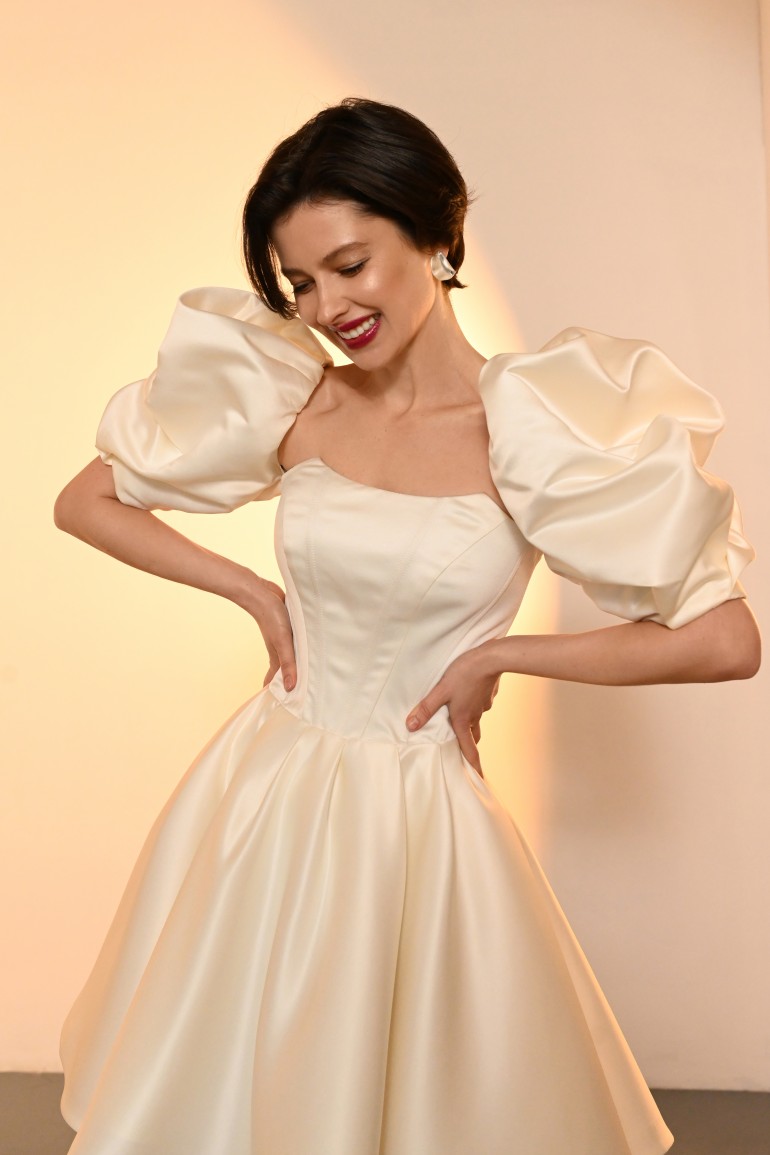 Сукня міні-довжини з приталеним силуетом і чітко окресленою талією. Верх виконаний у формі корсетного ліфа з відкритою лінією плечей, що підкреслює ключиці та шию. Об’ємні рукави з вираженою формою додають акценту й створюють ефектну лінію плечей. Спідниця розкльошена, формує легкий А-силует і забезпечує свободу рухів.