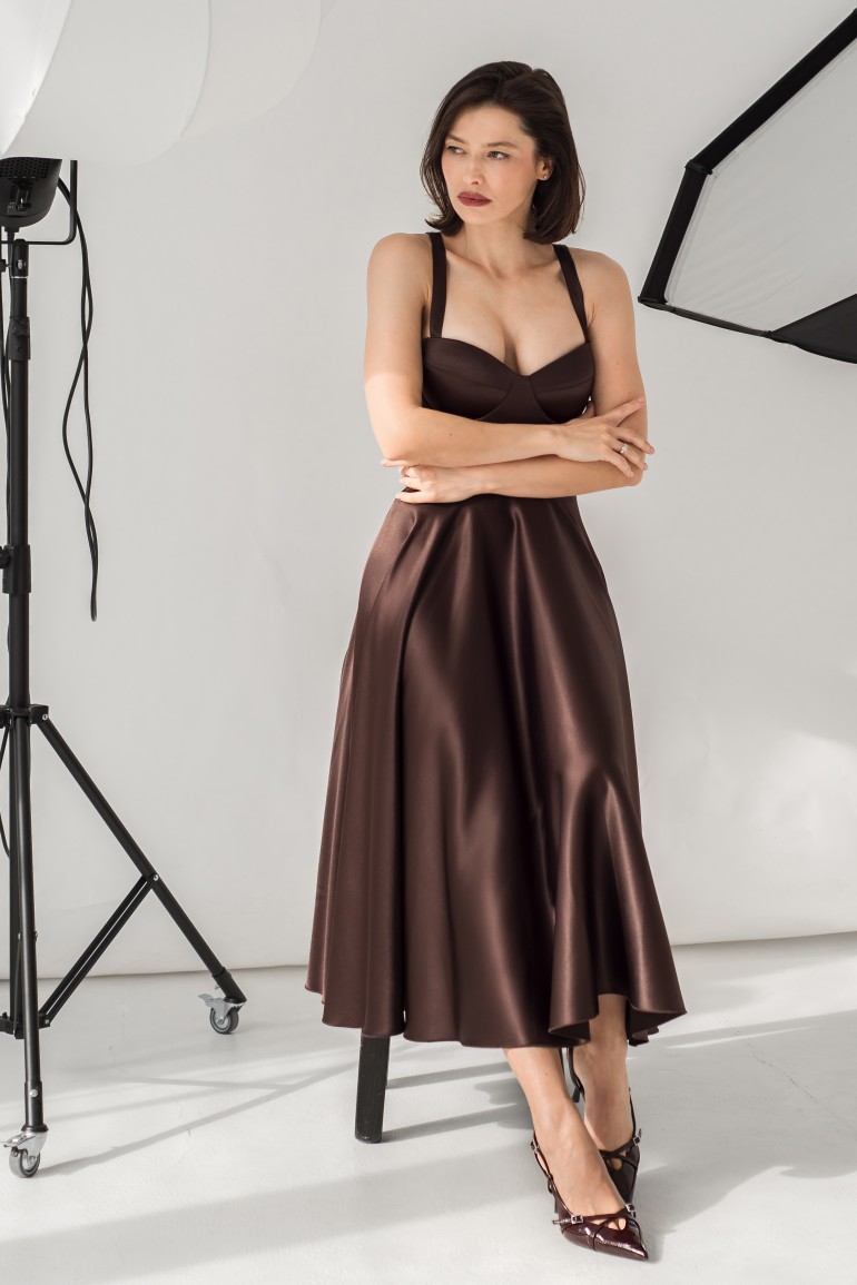 Сукня приталеного силуету на бретелях, що зав'язуються на бант. Ліф з втачними чашками. По переду вставлений ригелін для утворення корсетної форми виробу. Спідниця "сонце" міді довжини.