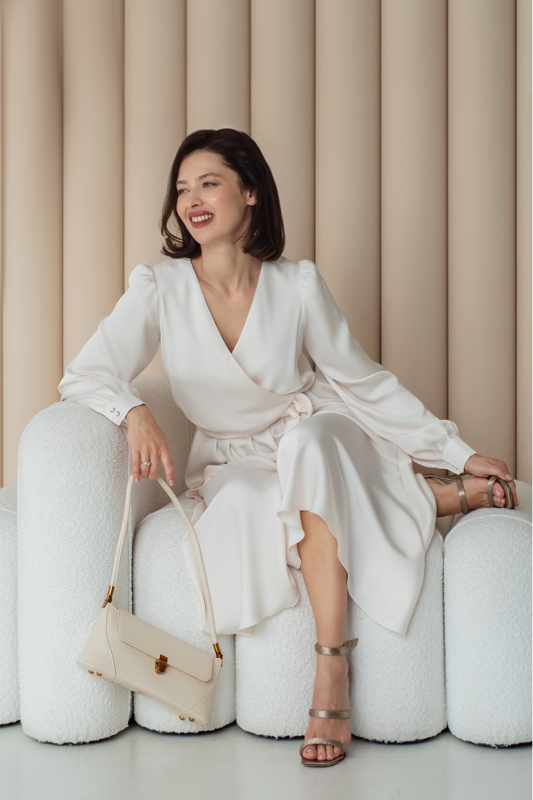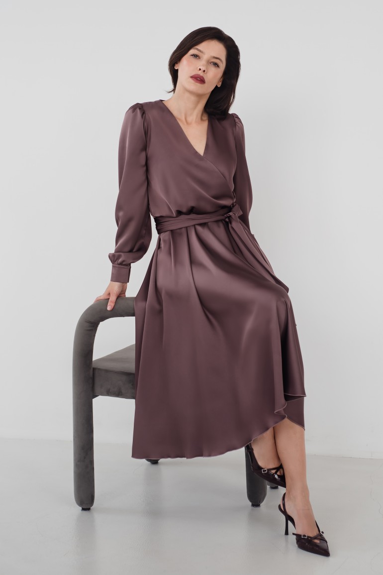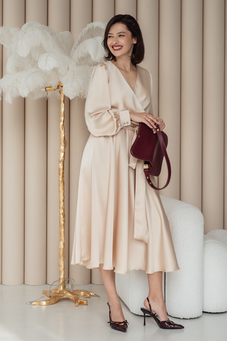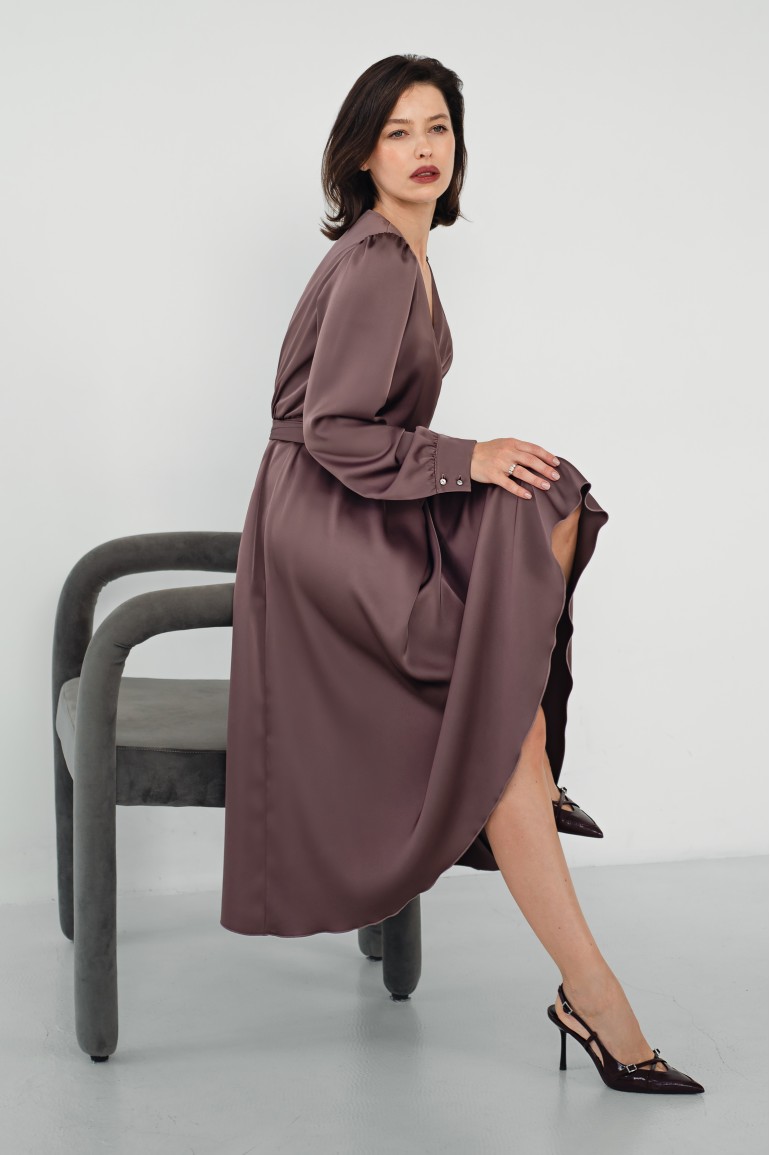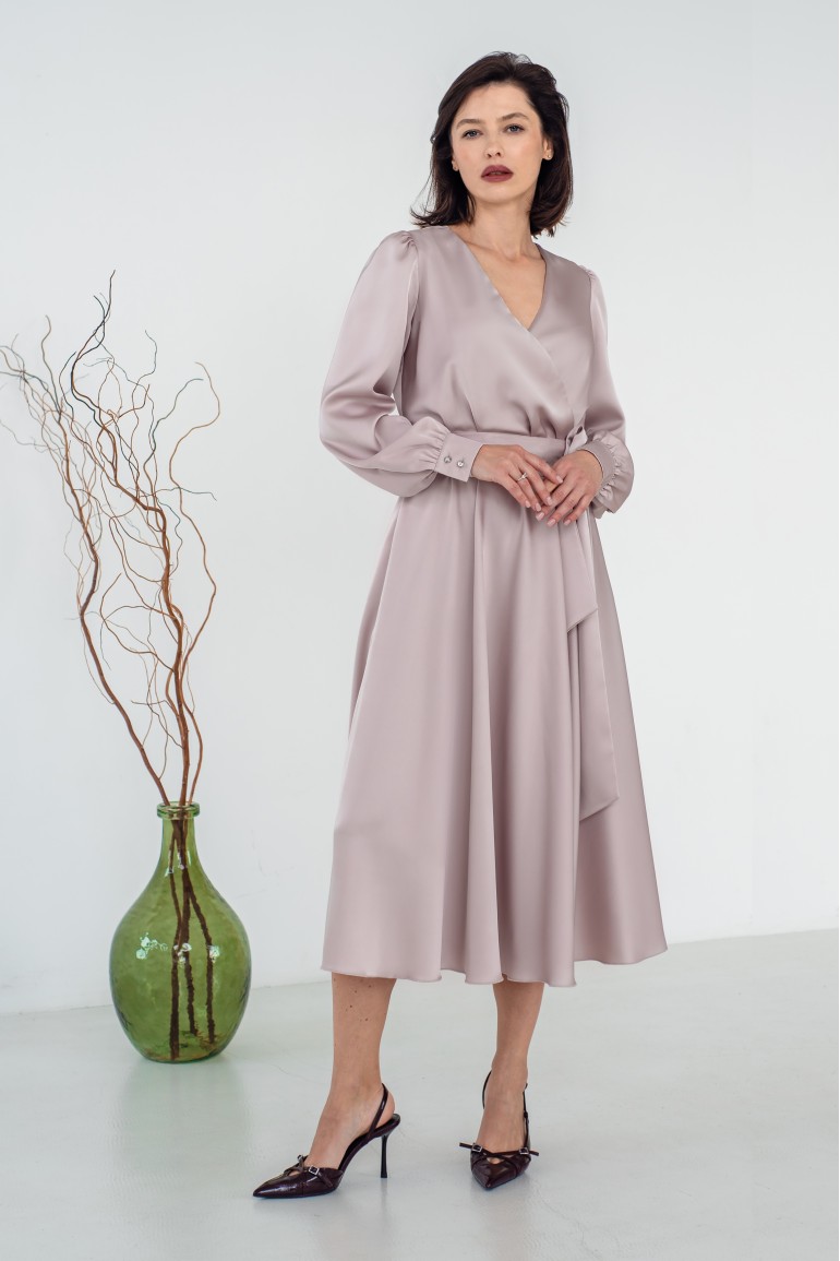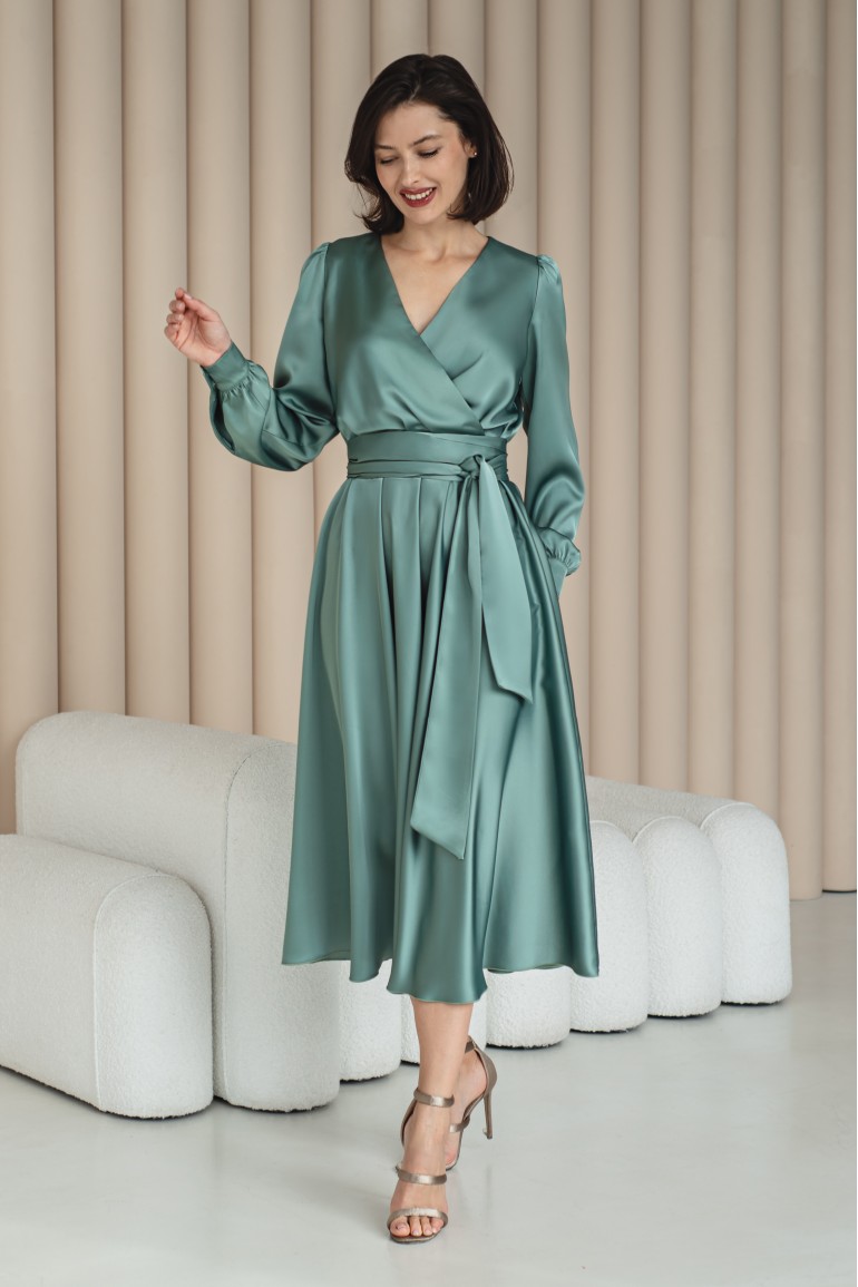 Святкова сукня безумовно створить святковий настрій для своєї власниці. Вона пошита по А-подібному силуету з запахом на ліфі. Рукава у сукні сягають лінії кисті і на краях оформлені в манжети, декорованими ексклюзивними ґудзиками. Плаття сягає середини литки. По лінії талії спідниці прошиті складки, які формують гарні фалди на розкльошеній атласній спідниці. В комплект також входить пояс.
