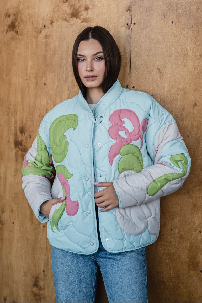 Утеплена куртка прямого крою з коміром і застібкою на кнопки. Авторська вишивка-аплікація робить цю модель унікальною. Контрастні рукави додають ще більше виразності.