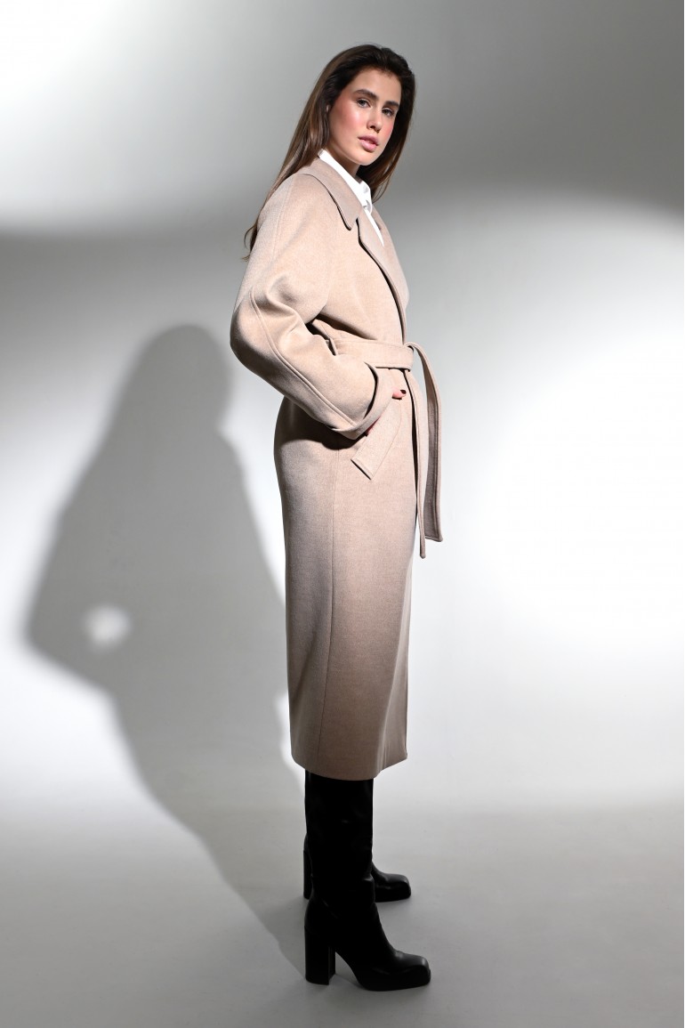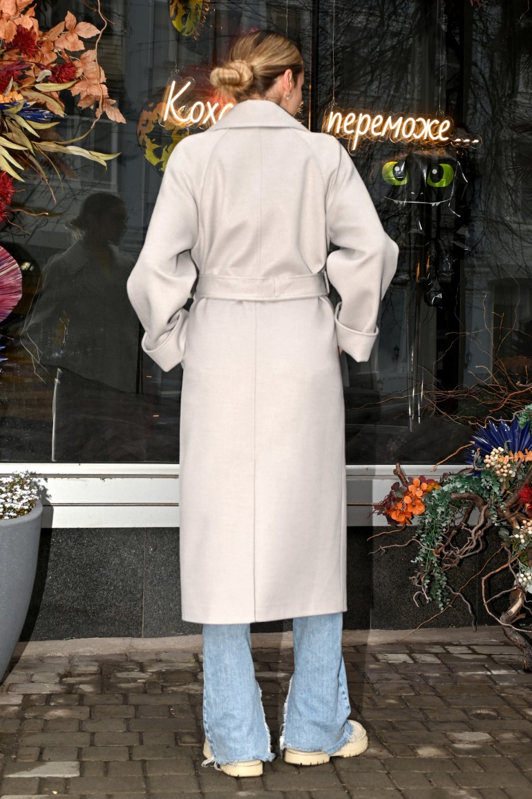 Подовжене пальто прямого крою у мінімалістичному стилі з широким коміром.